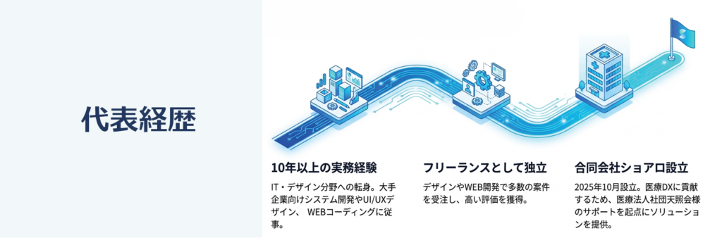これまでの経験を結集し、特に多くの機会に恵まれ知見を得た医療分野のDX(デジタルトランスフォーメーション)に貢献するため、2025年10月、合同会社ショアロを創立。